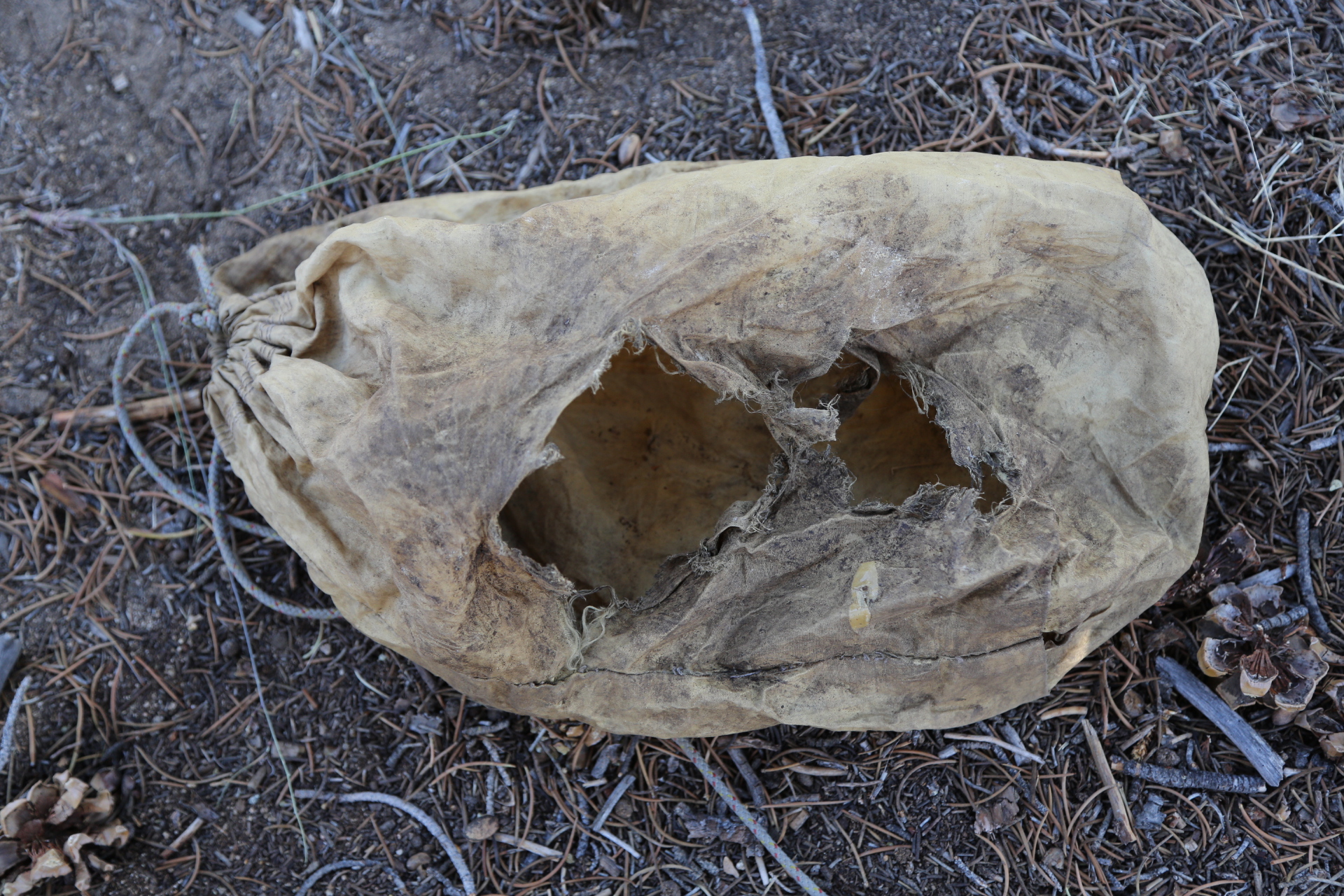 I am the founder/CEO of Ursack, and am terribly sorry for the problems you had with our product. I have inspected the photo you posted as much as possible, and can tell that your Ursack was a very old model. Given the color and the color/size of the cord, your Ursack was either one of our original Kevlar models (not made for about a decade) or a Vectran bag from about six years ago. We switched to Vectran when the military took all the Spectra fabric. For the last several years all our bear bags have been made from Spectra, which is much more robust than either Kevlar or Vectran. (Our newer Ursack Minor–made for rodents not bears–is made of a different weave of Kevlar).