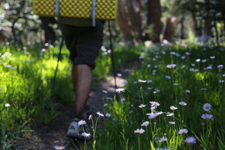 Though the swarms had dwindled, the remaining mosquitos encouraged us to pack up quickly after we woke. The trail quickly turned uphill, which helped us escape the bugs, and also led us into some spectacular wildflower patches. We saw mariposa lilies, paintbrush, lupine, Sierra daisies, flax, and whole hillsides covered in mule’s ears. What a treat!