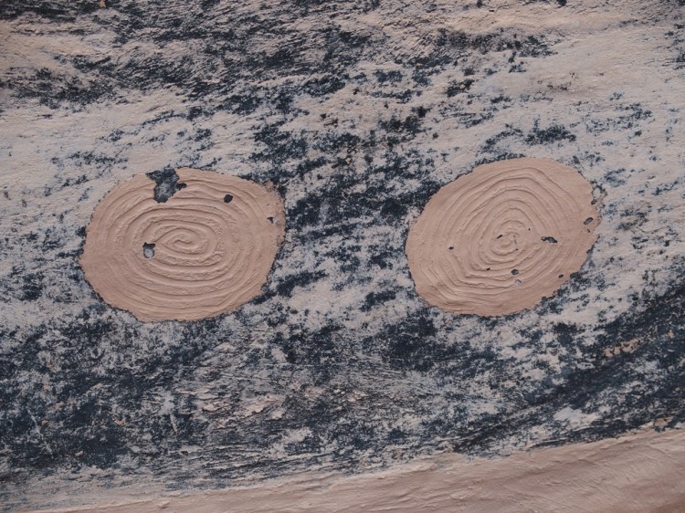 We liked these pointillist human figures, whose faces and elaborate headdresses have faded over time. A variety of hand prints are visible to the right.