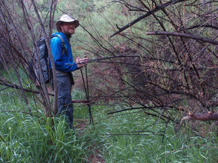 The path was very overgrown in some sections. At times it petered out completely, in which case we had to backtrack and find another route through the canyon. Right after Anna took this picture, a branch ripped a big hole in Chris’s hat, which had served him well for thousands of miles.